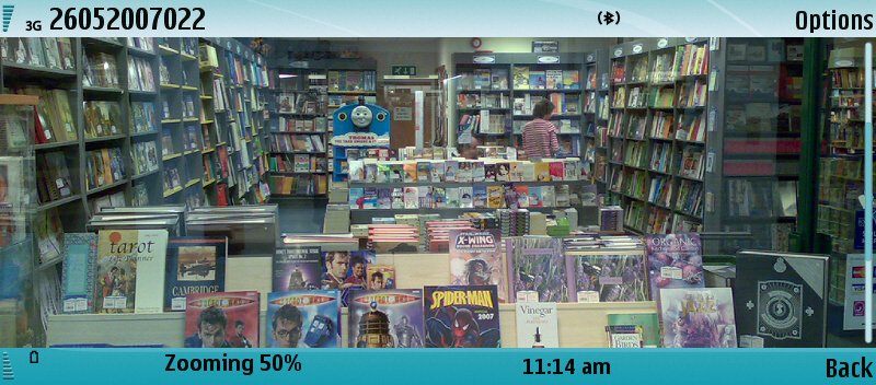 10am. Now 30 miles away in Farnborough, I had some free time while the ladies shopped(!) An hour of Hendrix, played over A2DP to my Nokia Bluetooth stereo headset. The A2DP implementation is pretty good, though with Wi-Fi scanning turned on in the background, there were occasional dropouts. Interestingly, if I stopped and tried to browse the Web using Wi-Fi while listening over A2DP, the music occasionally dropped in pitch, as if the musician's had dropped out of tune, presumably the wireless transmission buffering struggling and trying to stretch things out in order to keep playback going? Cutting the E90 some slack, though, this still isn't final sales firmware, and I'm sure there are still bugs to be quoshed.