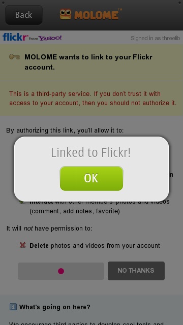 Molome works as you might expect, presenting an easy way of uploading modified/filtered photos to a wide variety of social and imaging networks: