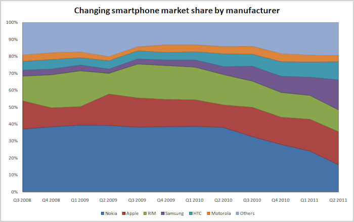 As a result of the fall in smartphone sales, Nokia's 15 year reign as the number one smartphone manufacturer comes to an end. Its 16.7 million units in Q2 were exceeded by Apple's 20.2 million, reflecting the problems facing Nokia in the smartphone space.