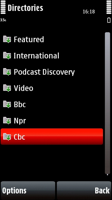 Click on the CBC directory name to update it. When it's finished updating, the icon will change colour and you can start browsing the CBC podcasts. To subscribe to a podcast or open a folder just click on it. Any podcasts you subscribe to will appear in the Podcasting app's main "podcasts" section.