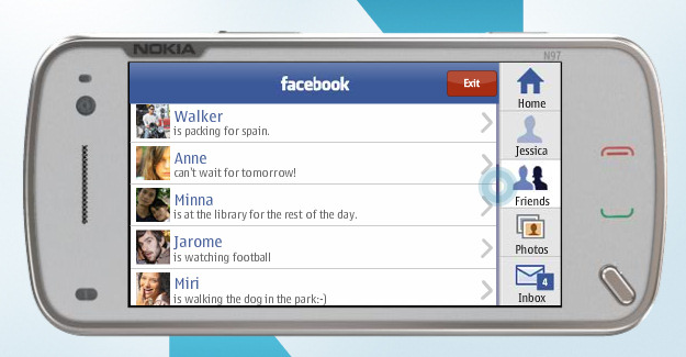 The home view of the Facebook application. The Facebook widget includes the ability to