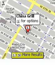 The underlying search is performed by the same engine used in Google Maps on the desktop, returning the ten top matches for your search string. Each is flagged, and pressing the appropriate number key on your keypad switches to each find. Simulataneously, you can also pan around, zoom in or out, switch between map and satellite views, and so on. Here's another example, looking for a chinese restaurant in New York: