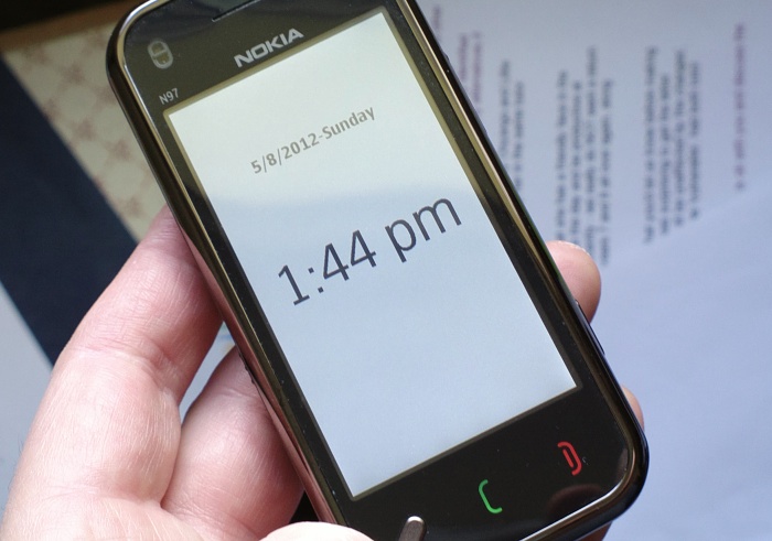 One of the biggest losses to day to day usability on the N97 mini is that of telling the time - the keylock screen just pops up a 'how to unlock' message - the underlying display may or may not show a clock. Make a beeline for the excellent Key Lock Clock. Once installed (and the device restarted), this utility acts to pop up a clock at normal brightness whenever you press the main N97 menu button - without disturbing the keylock itself.
