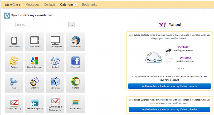 If you live in the Yahoo! cloud then you have a problem - there's no Mail for Exchange service. However, there is a convoluted workaround so you can have your email, contacts and calendar synchronized to your device. To start with, go to Mail, and add Yahoo! as a mailbox. Next, you'll need contacts and calendar sync setting up. For this you'll need to join a website called Memotoo.com, which is something of a PIM Hub and has been around for many years. Using the drop-down menu from either the calendar or contacts section, you can authorize Memotoo to synchronize with your Yahoo! account.