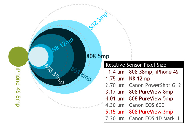 One of the unique aspects of the Nokia 808 is its massive sensor and oversampling system, whereby if you drop the output resolution you require (in Creative mode), you can get either more oversampling, as shown in this representation of the effective 'superpixel' size for the various 'Creative' resolutions: