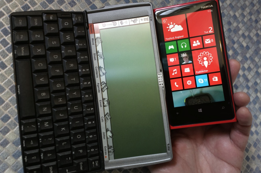 Psion Series 5mx with a modern Nokia Lumia 920 - note that the silvered areas are all part of the touchscreen, but mapped to specific control functions. Cool, eh?