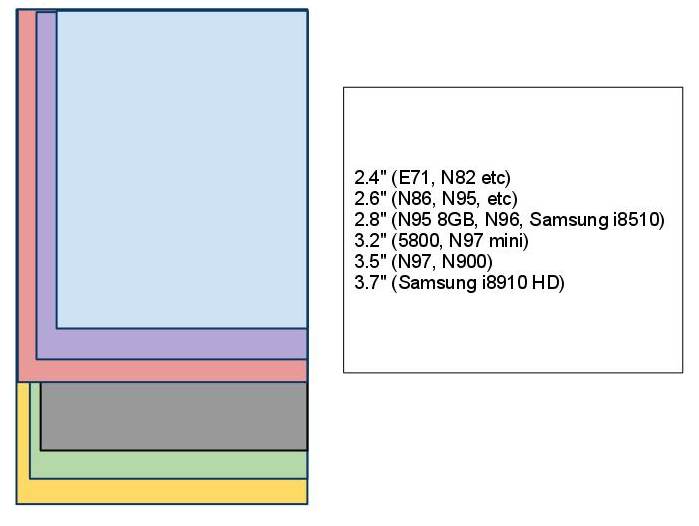 So, bearing all the above in mind, let's look at the screen sizes in the Symbian-powered smartphones of today. Note that in most cases, the list of devices using each screen size is too long to show in the graphic - hence the "etc". Note also that in some cases, the screens are used in landscape orientation, not the portrait shown (e.g. Nokia E71). Aligned top-right, here's how the screens listed would look when compared directly: