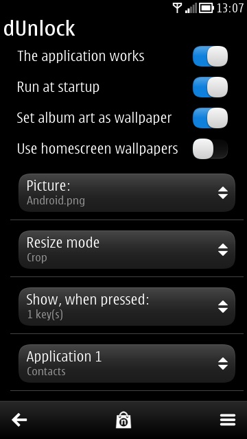 Launching the app from your main menu gives access to options that sets the applications behaviour. For example you can set which hardware keys activate Dunlock's lockscreen - the lock slide acts as normal and thus bypasses Dunlock. Other keys that can be used to launch Dunlock are the power key, call accept and reject, and by default the menu key.