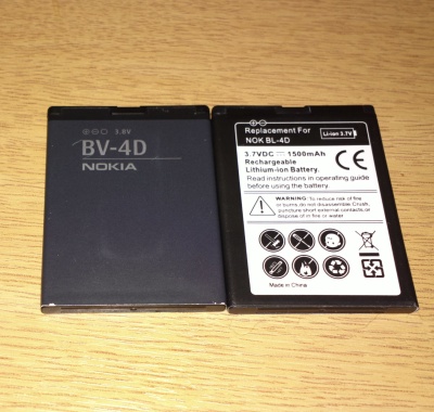I went for 2 BL-4D (rated as 3.7V 1500mAh) batteries plus charger. I was very sceptical as to whether they would hold any charge, but I can say that after over 2 months they are sound, In fact, they are just as good as the 3.8V 1400mAH 808 BV-4D. They are exactly the same dimensions as the original 808 BV-4D, obviously, Steve has previously reported on interchanging the BL-4D and BV-4D.