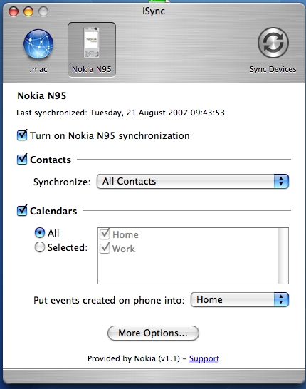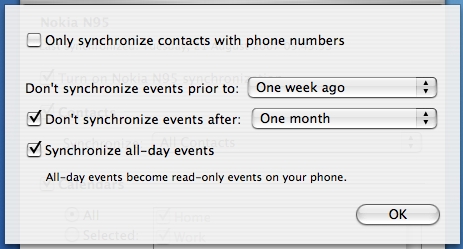 benleeke wrote:My N95 syncs with my mac but it seems to delete from the phone the previous months calendar details retaining the info on ical. So for example on the n95 I have August appointments but if I look at July there is nothing there. When we move to September Aug will be deleted from the phone.I cannot get isync to sync the previouse months calendar entries. Have I missed something?