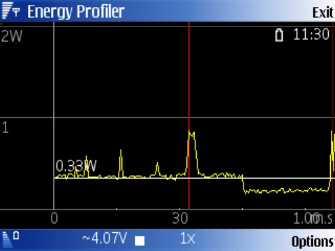 Info - the first three spikes are key presses, the larger spike by the red vertical line is when rotating the phone to landscape with RotateMe, and then the drop below the white horizontal line is the backlight going off. The final spike at the extreme right is RotateMe activating again as I shut Energy Profile down.