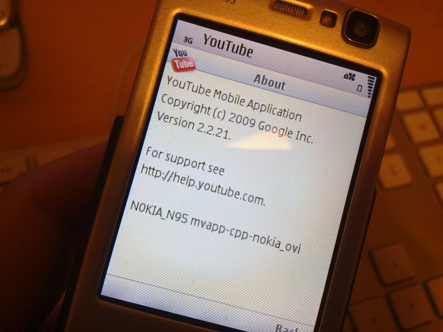 In a remarkable turn of events, Nokia's Ovi Store (e.g. see the client on your phone) has beaten another official outlet to the punch, with new versions of the free S60 YouTube client available - v2.2.21 for S60 3rd Edition phones and v2.2.29 for S60 5th Edition phones. No major feature changes, I'm afraid, and the menu is somewhat screwy on the latter version, but hey, it's free and it's new, right? Photo proof below.
