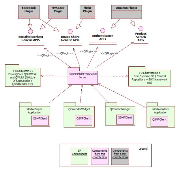 The Social Mobile Framework will provide a server and associated generic APIs for different types of services (e.g. social networking, image sharing, authentication, product search). Plug-ins for specific social networks (Facebook, MySpace, Twitter and so on) would be developed. These plug-ins would tie into and use the generic SMF APIs (e.g. a Facebook plug-in might tie into both the generic social networking and image sharing APIs); the advantage of this approach is that it requires less work to develop the plug-in (the common elements are provided by the SMF).