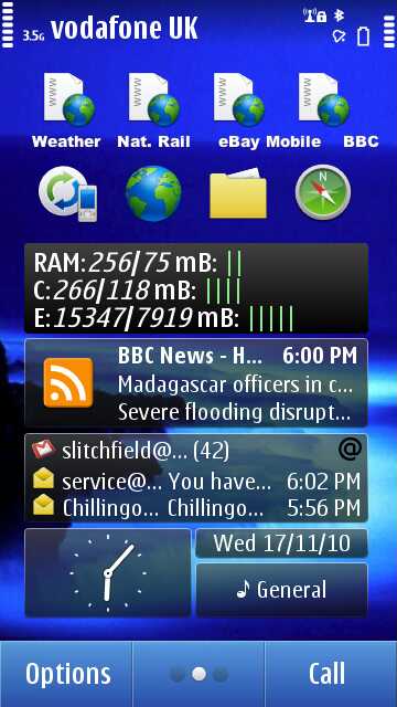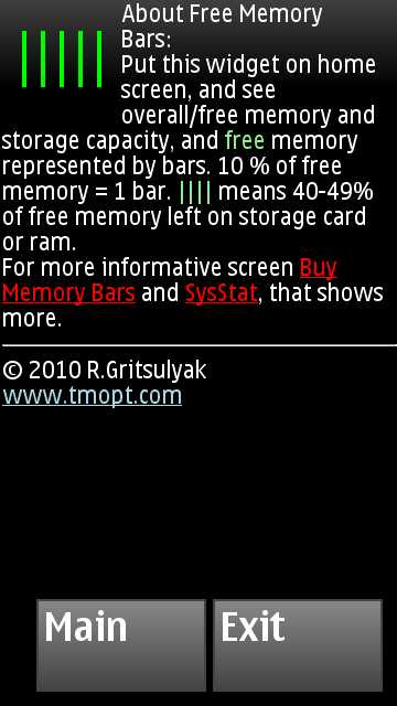 An at-a-glance readout of the amount of free RAM in your Symbian smartphone has always been a bit of a 'faff' to get, usually involving a dedicated full-screen utility. Free Memory Bars, released today in the Ovi Store, solves the problem by putting a Symbian homescreen widget panel to good use, showing RAM, C: disk and E: disk status, in terms of proportion free and figures in Megabytes.