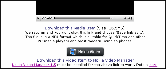 There is now a Nokia Video link for each of the videos in our media section. Following / clicking on these links will launch Nokia Video Manager and automatically download the video in question ready for transfer to your phone. In order for this to work you must have the most recent version of Nokia Video Manager installed.