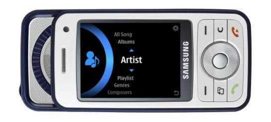 The down slide of the i450 activates the music player with its touch wheel navigation (the black area we assume). The i450 has its own music UI and support for multiple codecs including MP3, AAC, AAC+ , WMA and WMA with DRM. Samsung are also touting the ICEpower speaker which includes technology developed by Bang & Olufsen and it said to give better fidelity and battery life.
