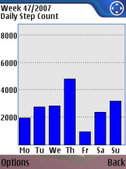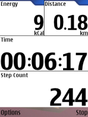 The Nokia Activity Monitor displays charts and statistics, in real-time, about your movements while walking or running. It counts the number of steps, and determines the distance covered and the energy expenditure. Summaries are stored in a diary so that you can compare your activity level on different days, and over longer periods of time. Your steps are detected by analysing the output from the accelerometer in an S60 smart phone. It is most accurate when you attach the phone to your belt, or upper arm, and it also works well if carry your phone in a pocket of your clothing. It might underestimate the number of steps if you keep the phone in a bag that you hold in your hand (as opposed to over your shoulder), and the most difficult case is when you hold the phone in your hand. Inevitably, false steps are detected sometimes, for example when you are cycling or driving.