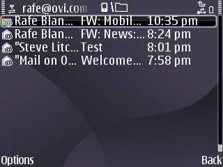 Here is an Ovi.com email account, set up in S60's standard messaging application. Ovi.com email accounts are made available via IMAP and, as such, could be used with any email client.