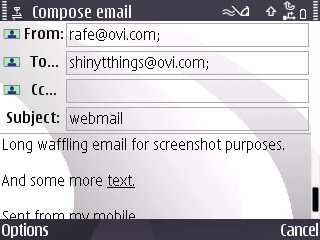Much remains to be seen, of course. Speed, the effectiveness of its 'Spam' filter, and so on. So far, Mail on Ovi has followed the GMail style in almost every regard, with similar spam settings and mail text quoting rules, but the key thing about this system is going to be the integration with your phone's email client and with Ovi Contacts, presenting a seamless and always backed up, always up to date contacts and email system.