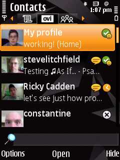 Ovi Contacts, which integrates with the Contacts application, is an instant messaging and presence sharing service. It allows you to chat to your friends (instant messaging) and share information about what you are doing (presence). The latter currently consists of a customisable message (status), music currently being played, call status, and location.