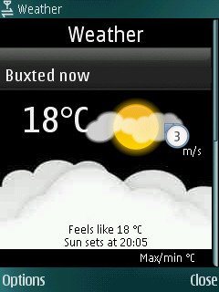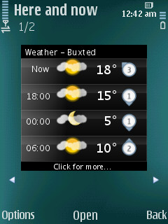 In the case of weather, you can click through to a web site for additional weather information, as shown above. Currently there are two services available via Here and now. The aforementioned weather and a nearby events listing. In my case, there was no information available for local events listing (perhaps not surprising for a rural area), so a rather non-descriptive question mark was displayed.