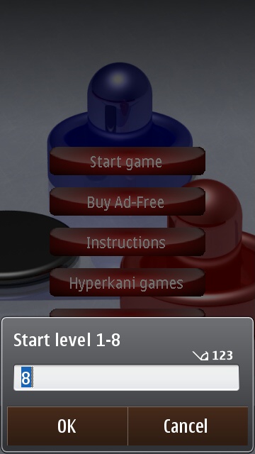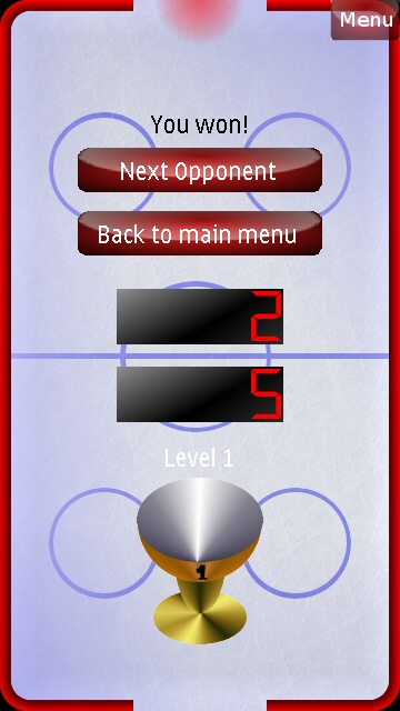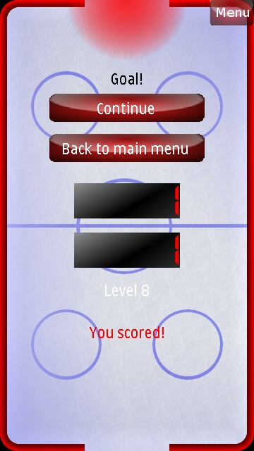 Air Hockey Touch is a pretty simple affair. From the menu screen, the only options you get are whether to turn the sound on or off, and which difficulty level to start playing at. In Air Hockey Touch you are limited to playing against an AI opponent, there is no multi-player option. Given how fast the game runs, I can almost believe there would be too much latency over a Bluetooth or 'net connection anyway. And given that the game was originally written for S60 5th Edition phones, most of which are not capable of multi-touch, the ever so cumbersome idea of having two people trying to play on the same screen wouldn't have worked either. The object of the game is to be the first to score five goals. When you win, the difficulty level of the AI increases by one level. Sounds easy, eh?