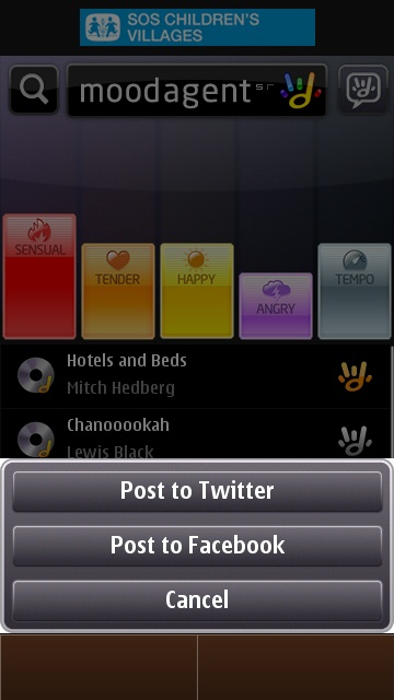 MoodAgent, previously known as Playlist DJ, takes a slightly different approach. MoodAgent has a massive database of music in the cloud, in which every track is scored on five attributes: Sensual, Tender, Happy, Angry, Tempo. When you first run MoodAgent, it takes a while to catalogue all of the tracks on your phone, it then communicates this list up to the MoodAgent servers. In return, MoodAgent servers send back the mood scores for all of the music you have stored.