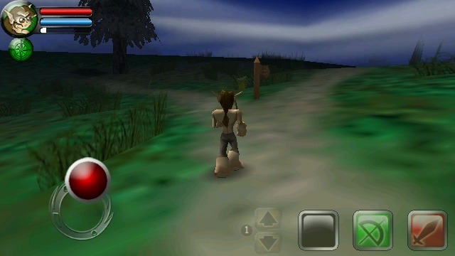 The joystick appears as a red disc in the lower left or right corner of the screen, there an option to choose which. Dragging the disc away from its centre moves your character, and the distance of the drag controls the speed of the movement - walking or running. Turning your character by walking in a circle will also move the camera (i.e. the player’s point of view), but you can also pan around your character by simply dragging an empty area of the screen.