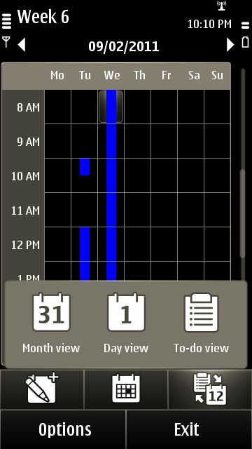 The Calendar application is the same standard application found in all Symbian^3 phones. It’s a useful but simple application, with four view modes: Day, Week, Month, and To-Do. Supported event types are Meetings, Anniversaries and To-Do list items. When creating events, locations are supported.