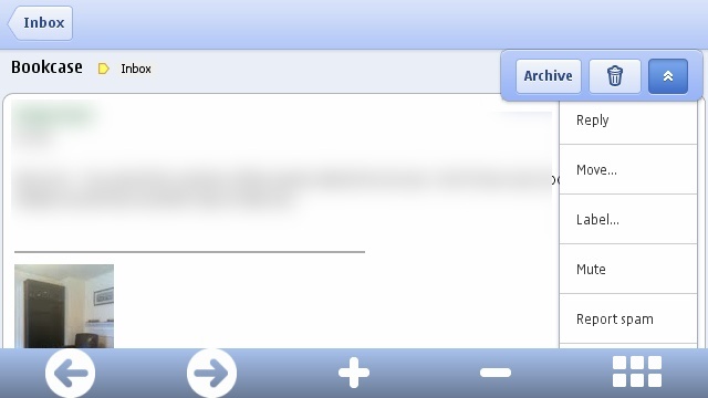 The Gmail interface is much like the enhanced iPhone/Android web interface that we’ve seen before. However, there are some important differences. Anyone who has used the enhanced Gmail mobile site in Web will be aware of the screen width issues. These problems have been fixed, allowing Gmail to fit perfectly in the 640 pixel landscape width for Symbian’s touchscreen format.