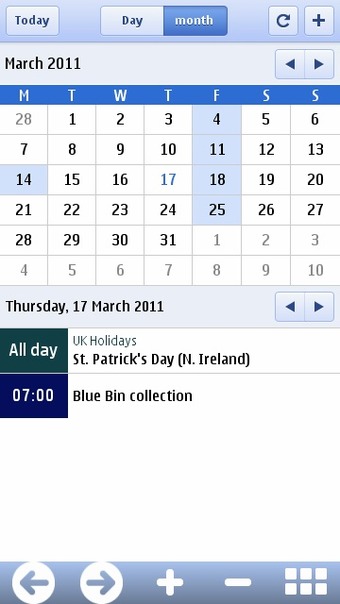 The Calendar interface is the same as the mobile web interface avilable to Symbian’s browser. The month view only indicates all-day events. Therefore, the user has to use the left and right hyperlinks, or select specific days, to see timed entries.