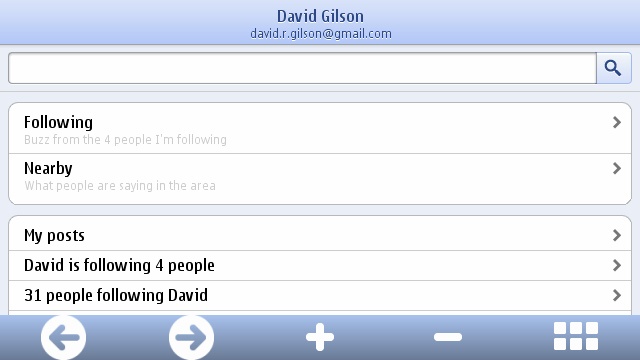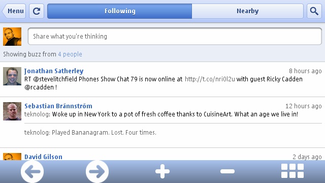 These all work with varying degrees of success. The lists of followers, for example, does not fill the screen, but instead is boxed off with scroll bars that don’t work. Also, finding Buzz updates from people nearby doesn’t yet work because the application cannot access the phone’s location.