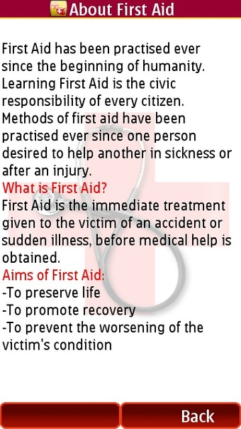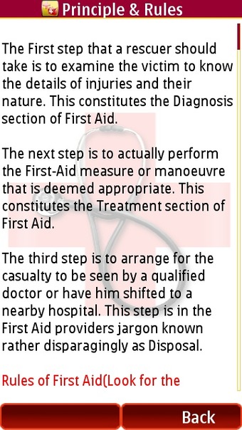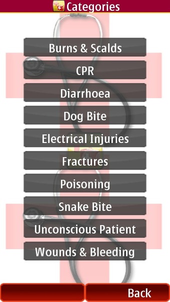 This application can be best described as an e-book - in the form of an application. There are introductory passages about general rules that first aid practitioners need to follow. Tapping through to the “Categories” section then lists the health topics covered by the application.