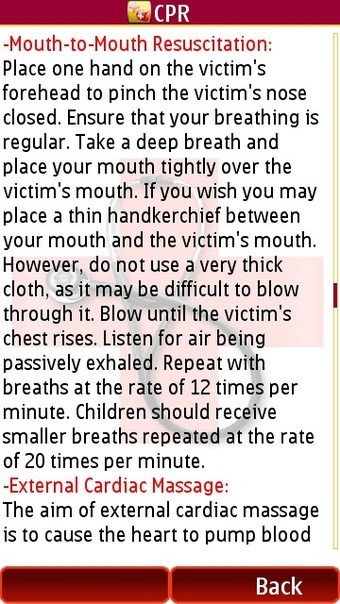 Having read through the application, I can say that each section is clearly written, and has no confusing instructions. This is crucial, especially when trying to determine what to do in an emergency if you have no other medical reference. However, it concerns me that the application is completely text based. There are no illustrations whatsoever.