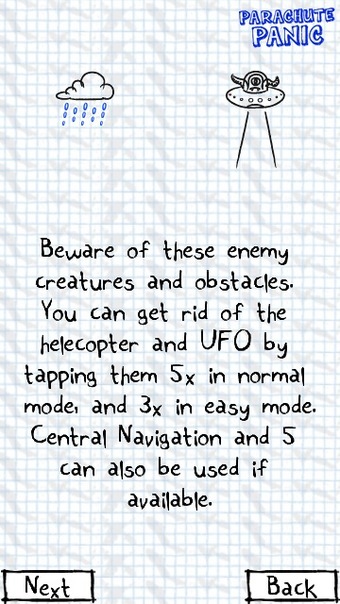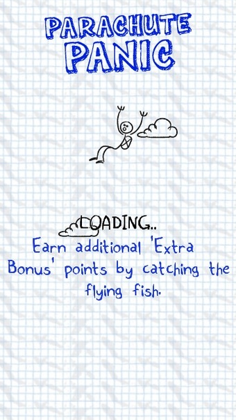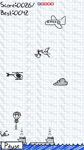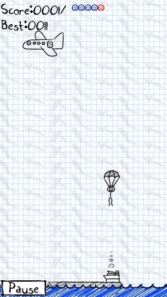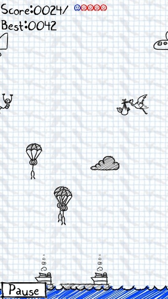 Given its ‘vertical drop’ nature, Parachute Panic only works in portrait mode. The graphical style is very appealing, and reminiscent of Doodle Jump. Reproducing the hand-drawn style, Parachute Panic looks very much like a ballpoint pen doodle that has come to life. The backdrop of the game is a sheet of squared paper. I can see that the designer has tried to add some shading to created a crumpled effect. However, the repetitive pattern breaks the illusion. If the people responsible see this review, I suggest they read up the Cicada Principle!
