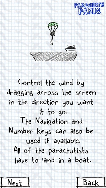So far so good, at this level of game play, things are still manageable, but the game soon earns the right to call itself Parachute Panic. Soon there are multiple free-falling stick men. You have the deploy all of their chutes and guide them all to safety. One trick not described in the tutorial pages is that if the stick men are guided to either side of the screen, they will wrap around to the other side.