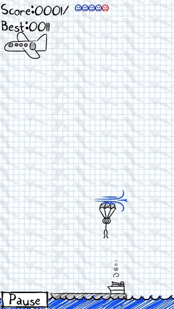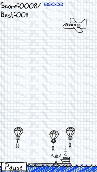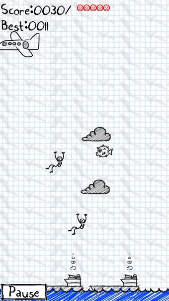 The game space primarily consists of planes that fly above, and ships floating along the water-filled bottom of the screen. As the planes cross the top of the screen, stick men will jump out. Most of the time, they are in free fall and require a tap from you to deploy their parachute.