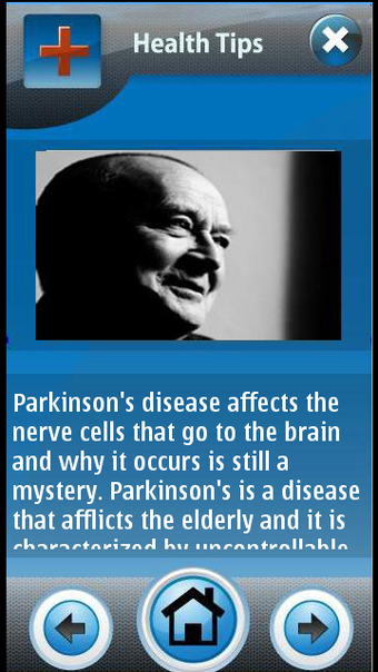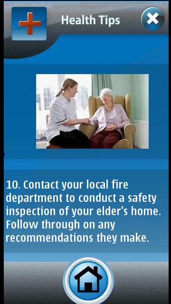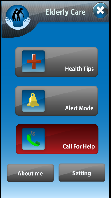 The main user interface of Elderly Care has three large buttons. The first is “Health Tips”, which presents the guides described above. The next two, “Alert Mode” and “Call for Help” are both services for an elderly person to use.