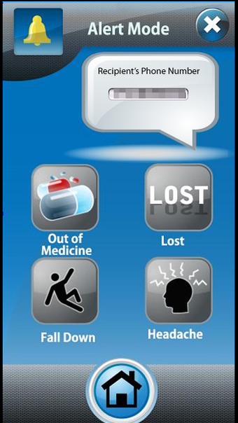 The Alert Mode gives four large buttons, which each send a pre-set SMS to a phone number which must be added via the Settings screen. The buttons are labelled: “Out of medicine”, “Lost”, “Fall(en) down”, “Headache”. You can see the messages that the carer will receive in the screenshot below. There is no feedback to tell the user that messages are in the process of being sent. However, a success message is eventually shown to confirm that the message was sent. The delay might be a little disconcerting to anyone not technically inclined, and who is either nervous or impatient with technology.