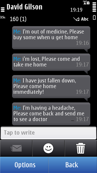 These messages cannot be changed; which is something the pedantic technology reviewer in me would like to complain about. However, if the messages could be changed to anything, e.g. to fit the specific needs of the elderly person being cared for, there would be the problem of creating new and memorable icons. All of a sudden, the application would be made too complicated for someone who may already be struggling to find their way around a mobile phone in the first place.
