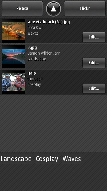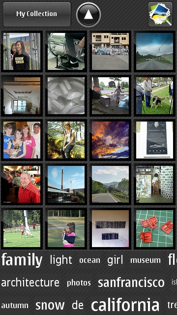 Pocket View has three views, which can be switched via swiping gestures. The first and third views show images from Picasa and Flickr respectively. For each photo service, a gallery of most recent photo uploads are shown. Strangely, Picasa only shows fifteen thumbnails, while Flickr shows twenty.