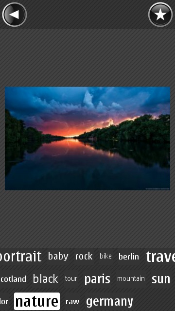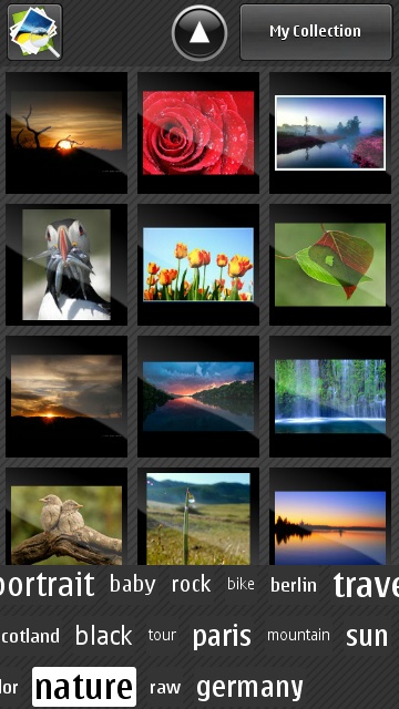 In addition to image thumbnails, each view has a tag cloud at the bottom, which horizontally scrolls with a swipe of the finger. The font size of each tag supposedly represents its popularity. As you might expect, tapping a tag brings up a gallery of matching images. If the subject you're looking for isn't in the tag cloud, then tapping the yellow icon in the top corner of the screen reveals a search box.
