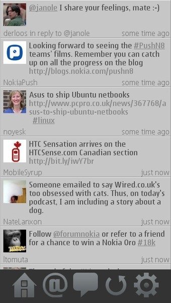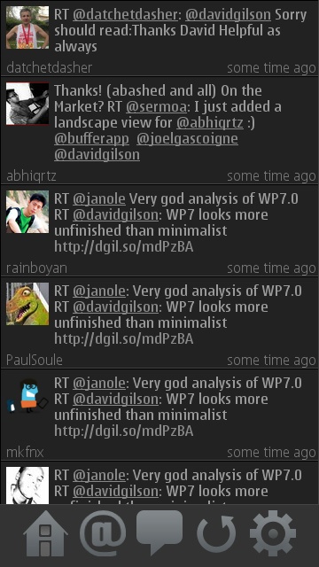 The main page of TwimGo shows six tweets at a time, in a kinetically scrolling list. Similarly to Gravity, it has a 'light' and 'dark' theme to suit your mood and ambient lighting (and desire to be friendly to your OLED-powering battery). Along the bottom of the screen is a handy toolbar with five buttons: Home, @ replies, make a new tweet, refresh, and main menu. Even though there is a manual refresh button, TwimGo also has an automatic update setting for intervals of one, five, fifteen, or thirty minutes.