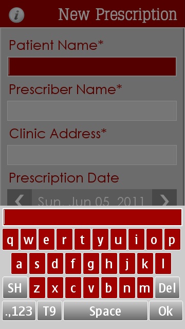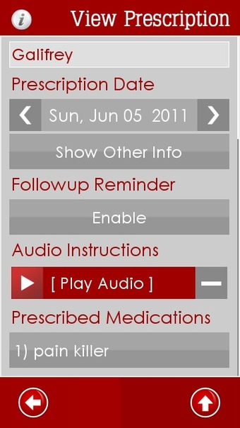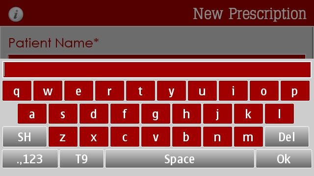 You can save an extensive amount of information in each virtual prescription. You start off with the patient's name, doctor's name, and the surgery/clinic address, followed by when the next prescription is due. There's an 'Other info' section in which to put the patient's age, surgery phone number and opening hours. After this you can set a reminder for follow-ups. It's not clear whether this is meant to be for a follow up consultation or subsequent repeat prescription. It could be used for either, as long as you're consistent and don't get confused. A novel feature is the ability to attach an audio note, allowing you to quickly capture information in-situ, about the medication. There are two software keys at the bottom of each page, one for going back a page, and one for a context menu. From the prescription edit page, there is a context option to 'Add Medication'.
