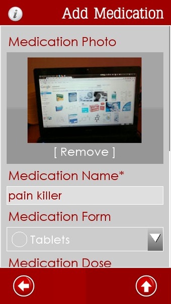 When adding medication, the first option is to take a photo (within the app) of the medication. This can be useful for several reasons. If you were in a rush, taking a photo of the packaging would be quicker than typing a complicated name. Another scenario could be that the tablets had already been taken out of their packaging, and placed in some sort of organiser by someone else. Then, you might need a visual clue for which tablet is which, etc. The next input allows you to enter the medication name. Next there is a drop down list of what type of medication it is; e.g. tablet, inhaler, injection, etc. Following from those options you can add the dose, quantity and/or number of required refills, as appropriate.