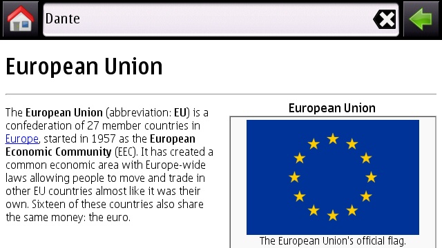 You may recognise the user interface of Mopedi from our review of WikiQuotes. That's because it is essentially the same application, by the same person, wrapped around a different set of data, in this case Wikipedia. The general user interface is very simple. A search box sits above six huge buttons. The first button brings up a list of your bookmarks and history, each on their own tab. The second brings up a list of articles that are about locations close to you. It determines this by calculating your position based on cell tower location. The third button is the random article list, which I was pleased to see in the WikiQuotes application too. The next three buttons are for settings, help and exit.