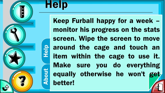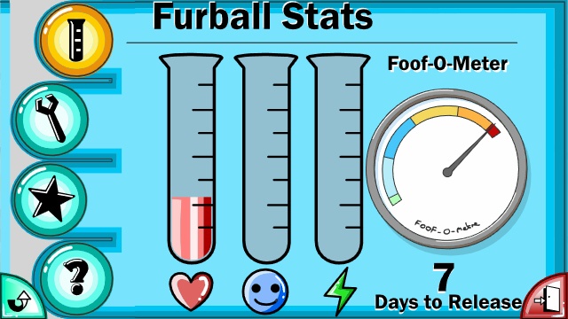 You discover through the help pages that your objective is to care for Furball for seven days. If you do that successfully he'll be released from the hospital. Given that game progress is lost when the game is shut down, we're clearly not dealing with real time here. To 'cure' Furball, he has to be taken through a routine of 'therapeutic' activities, which will help with his three main attributes. They're unnamed, but going by the icons, they look like health, happiness, and energy.