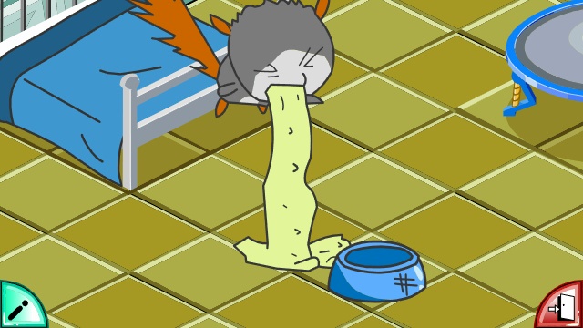 Accompanying these games, there are plenty of strange and heart-tugging animations. For example, with the bathing game, a clear tube closes on top of him. Prior to being sucked away to the bathroom, he looks terrified and makes big 'puppy dog' eyes at you. Meanwhile, after the feeding game, he eats a dish load of squashed bugs, and then proceeds to vomit everywhere! It's fair to say this is game is comically cute while being subversively disturbing too!