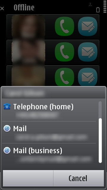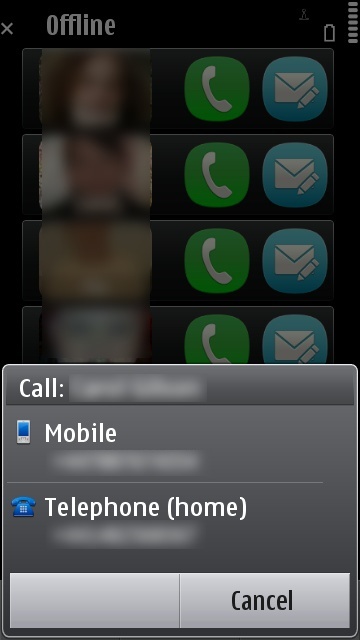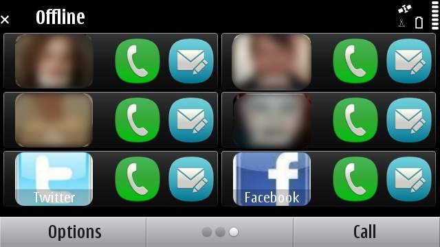 A corner stone of any widget set is the contacts widget. Whether you want the favourite people in your personal life, your work contacts, or just your most frequently contacted people; a screen full of the faces to frequently connect with is essential. The favourite contacts widget in Symbian^3 comes in the form of a horizontally scrolling list of contact images. This is an adequate approach, but it's also limiting. For example, only up to four contacts can ever be shown at once.