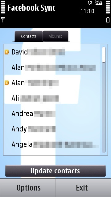 The main screen of Facebook Sync gives you a list of all of your Facebook contacts. Any names that match people in your Symbian Contacts application are marked with an icon. Tapping a contact once selects it, a second tap displays its details.